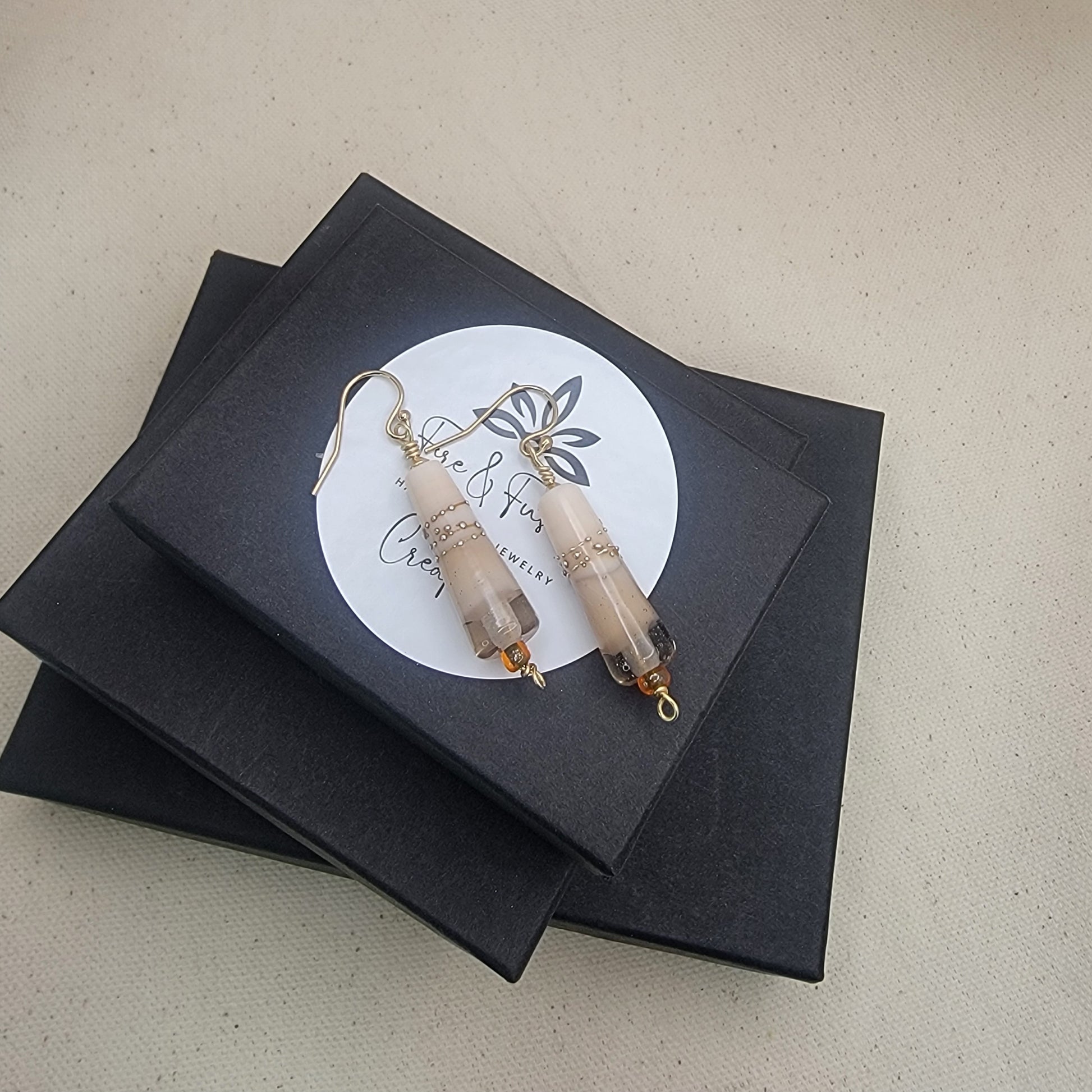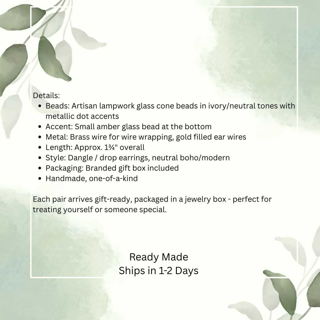 Each pair is built around handmade lampwork cone beads in layers of ivory, sand, and clear glass, accented with tiny metallic dots and a warm amber glass accent at the base. I’ve wire wrapped them with brass wire and finished them with gold filled ear wires for comfortable, long-lasting wear.