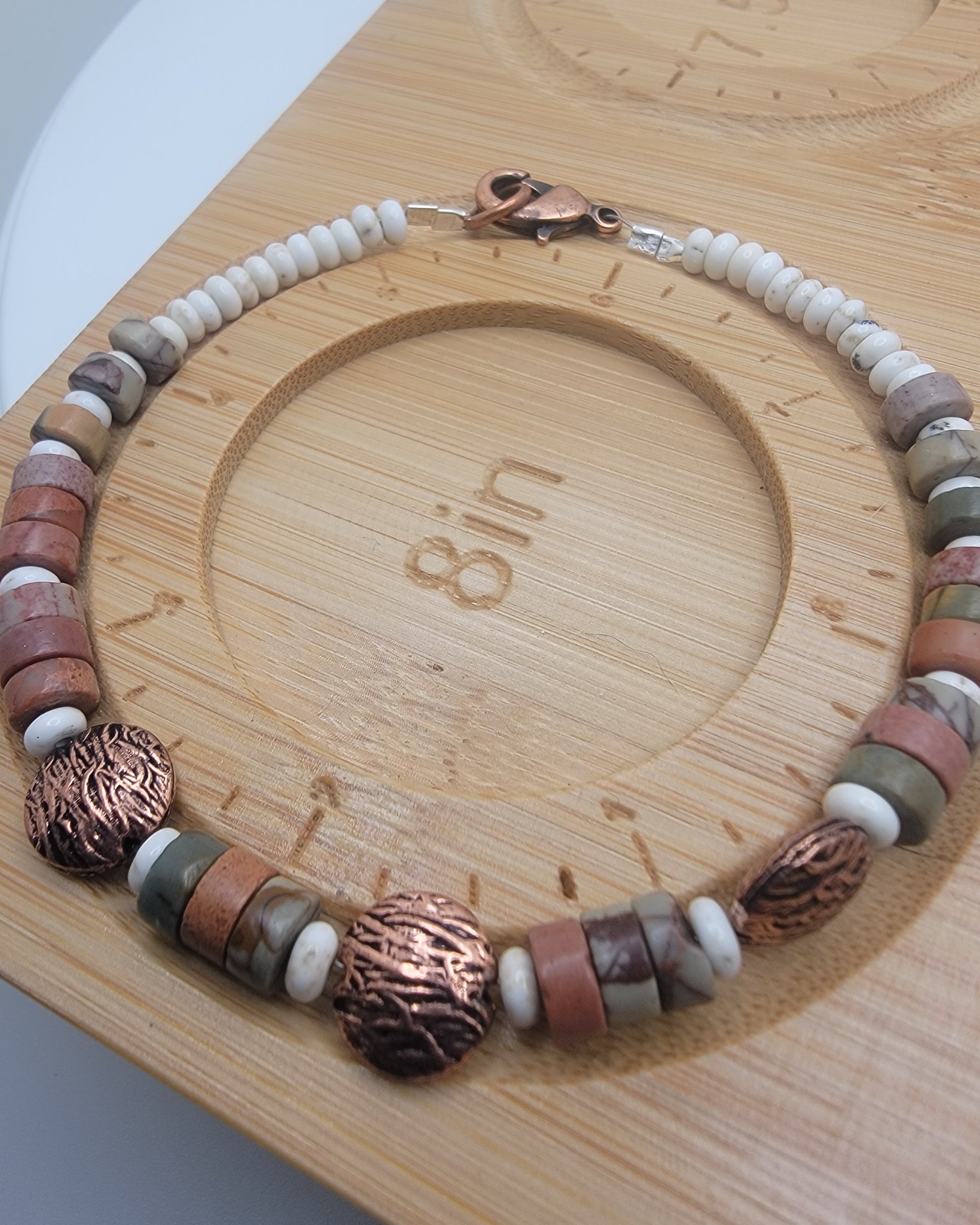 This 8-inch bracelet features stunning Red Creek Jasper beads, each showcasing earthy tones and intricate natural patterns. Complemented by polished copper beads, the bracelet exudes a warm, rustic elegance. Finished with a secure lobster clasp, it offers both style and functionality, making it a perfect accessory for any occasion.