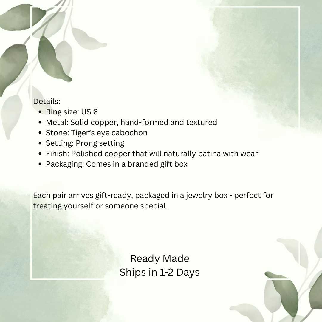 Copper Tiger’s Eye Ring – Handcrafted Textured Copper Band with Tiger’s Eye Cabochon, Size 6
