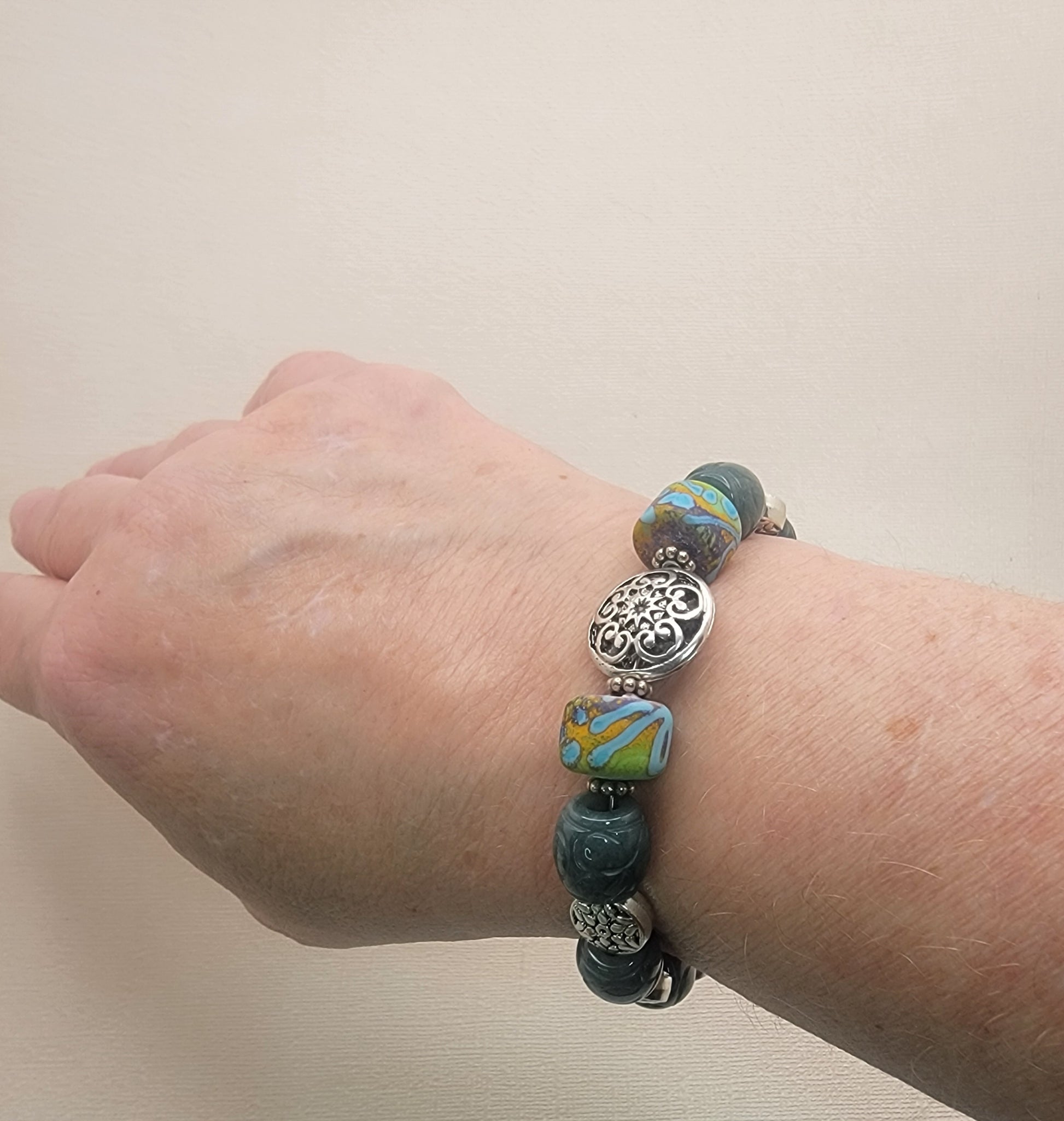 This one-of-a-kind bracelet features a mix of rare jade and artisan glass with detailed silver accents.