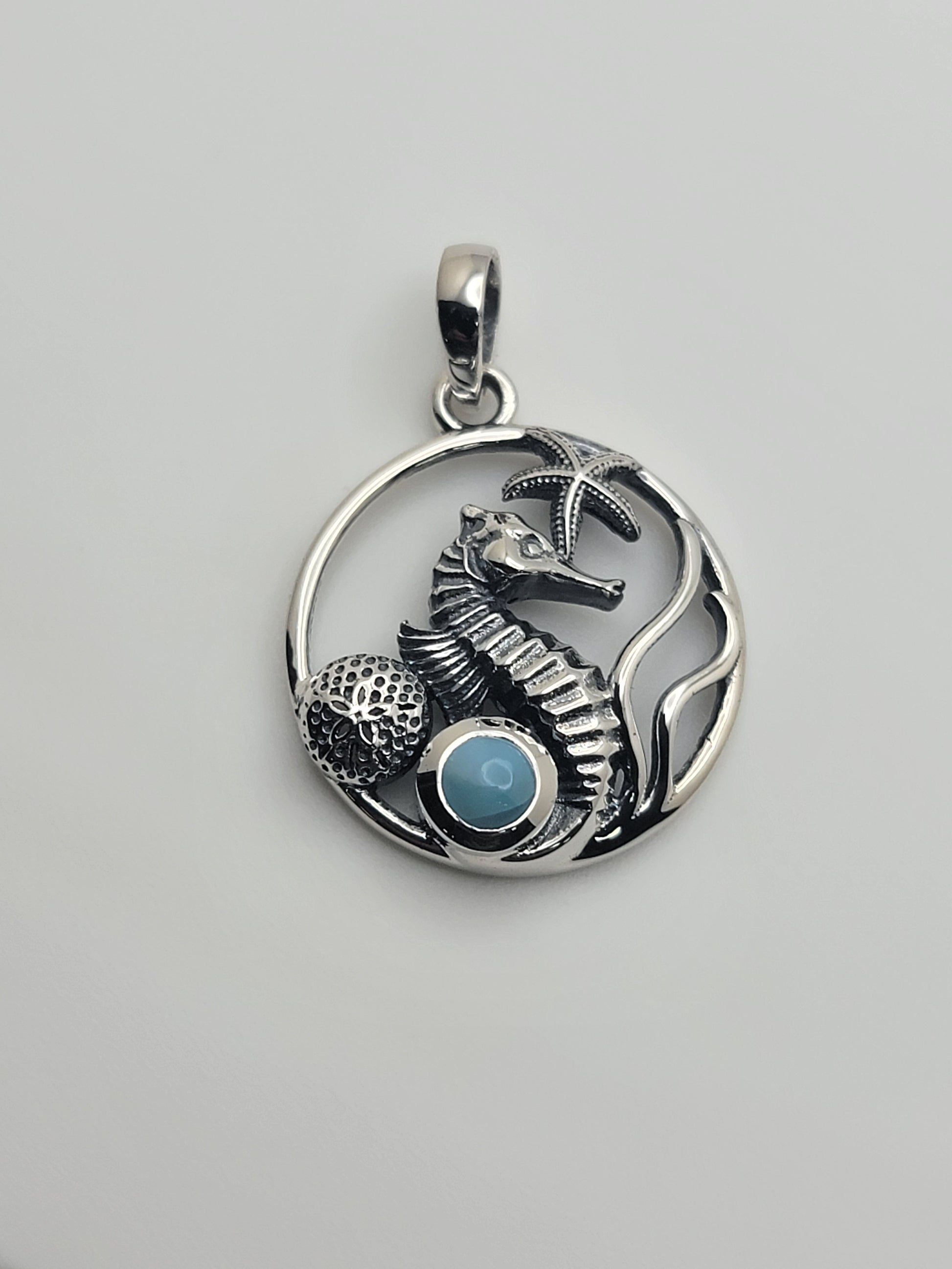 This charming sterling silver pendant features a detailed seahorse and ocean motif, accented by a tranquil larimar cabochon that captures the essence of the ocean.